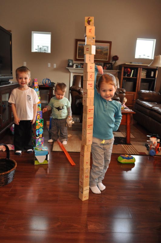 Gracie loved building really tall towers with the blocks. The first one she knocked over set off the glass break alarm in our house. š I turned the alarm off and we went back to building.