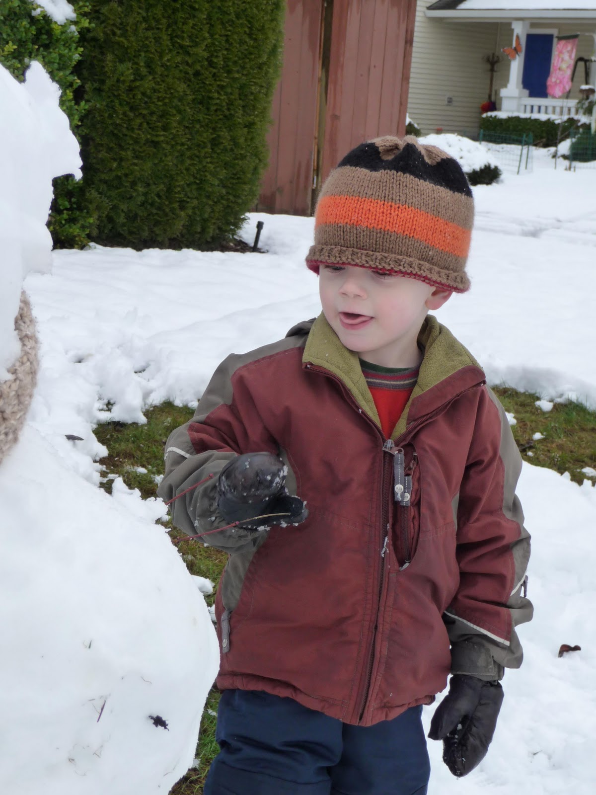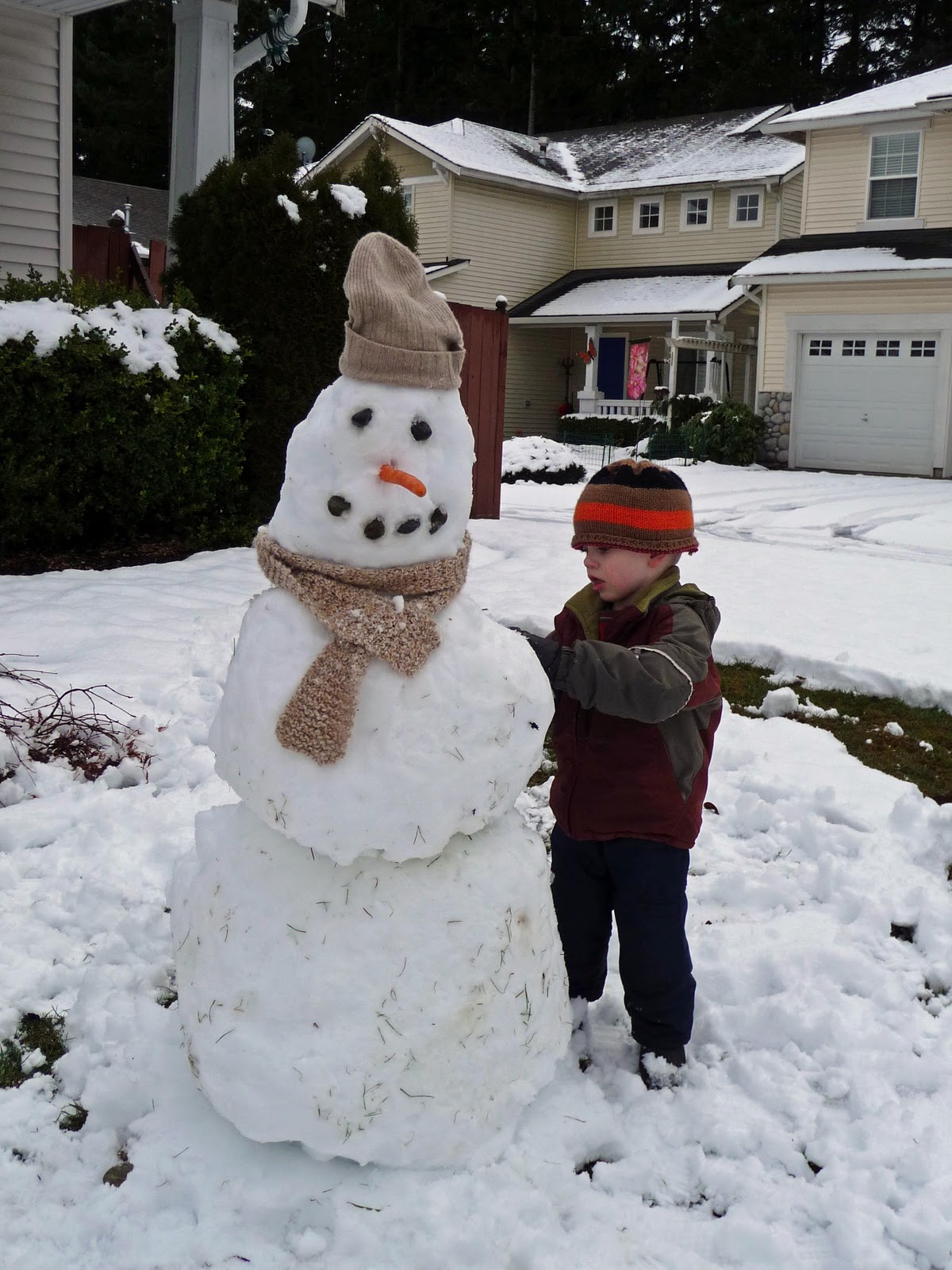 JT’s goal for today was to build a snowman. The weather warmed a little and last night’s snowfall cooperated, leaving us with perfect snowman snow. Before lunch we walked to the park and came home to build our snowman.