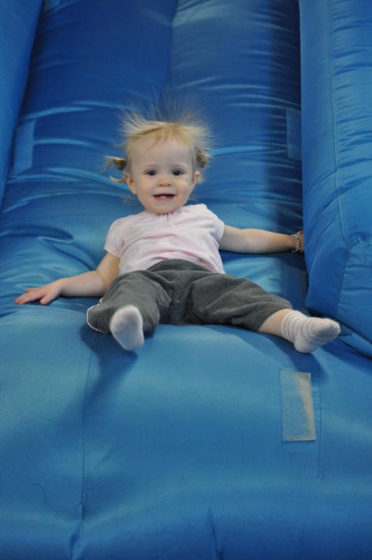 | Headed up the big slide. Then she found out she wasn’t all enough to reach the steps and had to be carried up. |