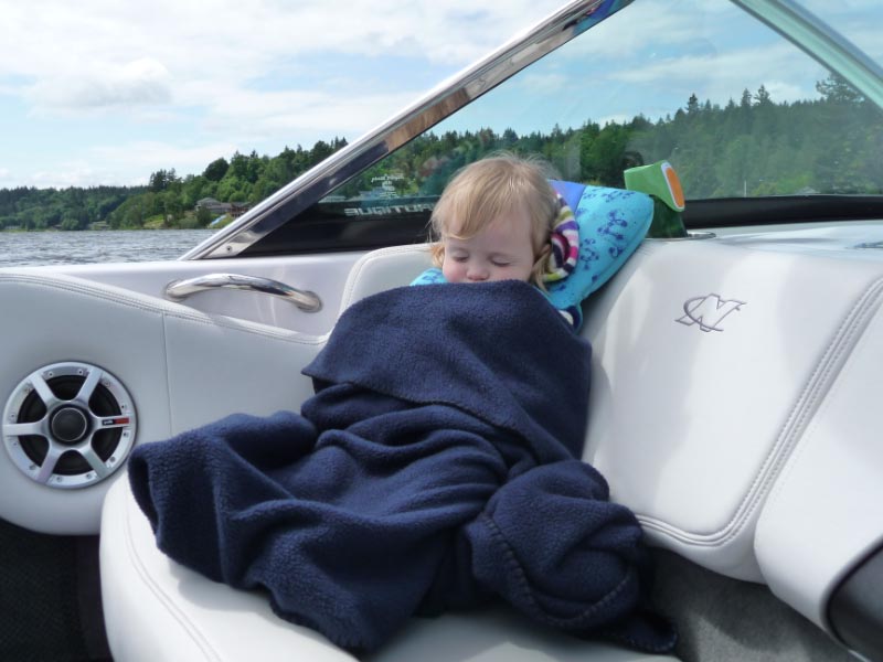 Once we just took JT with us in the boat. He and I had a little snooze in the bow (he’s pretending, but it was still nice and relaxing).