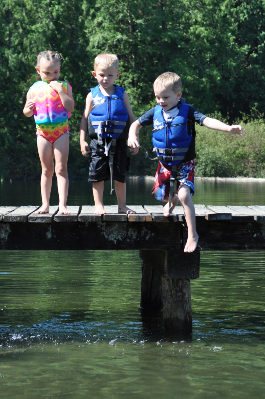 On to the fun stuff. JT is so fun this summer. He is trying more and more things. For example, he started jumping off the dock into waist-deep water. Then I encouraged him to move out so he wouldn’t hurt his legs if he landed wrong. Soon he was jumping off the very end of the dock, into water over my head. Then he would swim back to shore and do it again. He even ran off the dock and jumped in once. He was the only kid to conquer the “deep end” and he had a great time doing it.