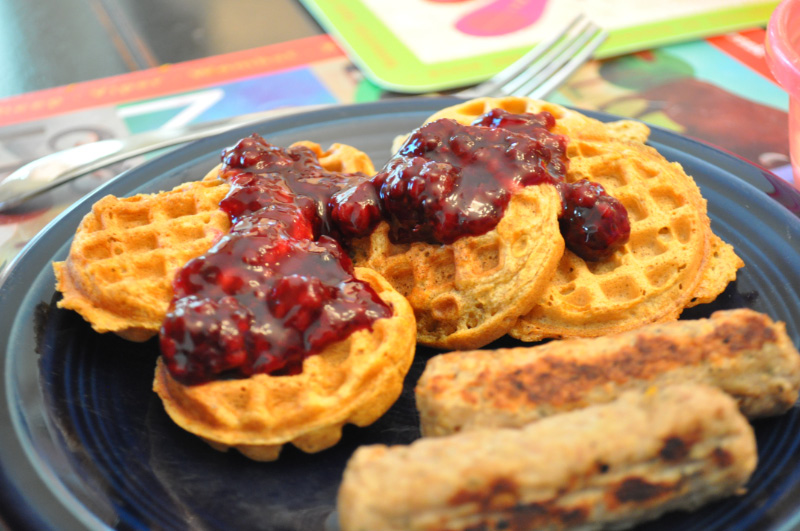 My friend Sarah got me a mini waffle maker and it is really fun. The best part is that the waffles are just the right size to pop in your mouth. Pretty soon, you’ve eaten, well, a lot of them. We made some blackberry sauce from the berries we picked to go on top. Yummmmm.