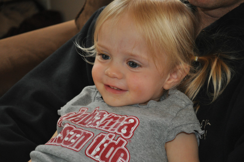 She was wearing her new Alabama shirt that comes fresh from Alabama. A big thanks to cousin Bevin for doing our shopping from across the country and for mailing us the clothes for Haley to wear. She was all out! Haley calls this her “Roll Tide shirt.”