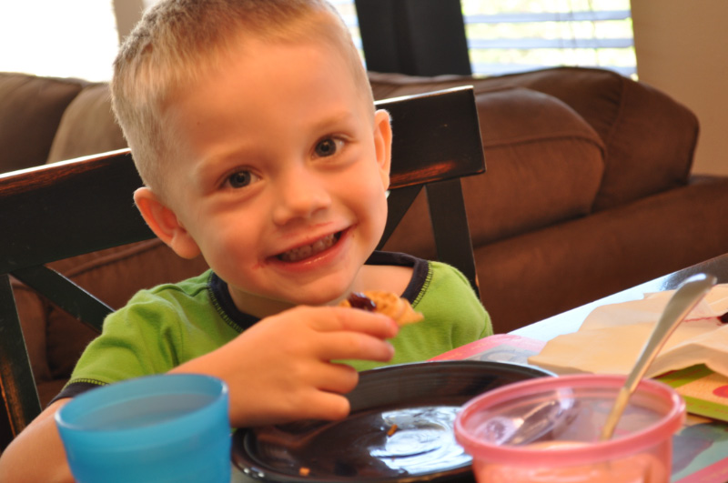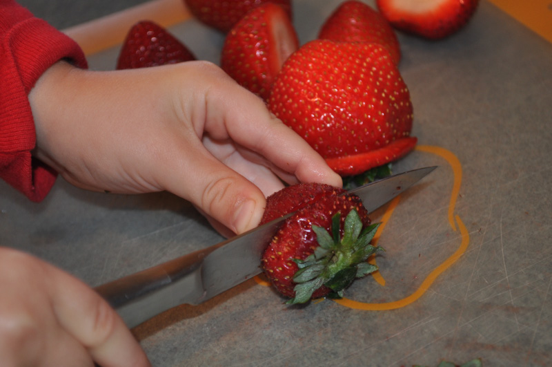 Meanwhile, JT helped me make a fruit salad. He cut all of the strawberries’ tops off, and then in quarters, by himself with a real paring knife. He was really proud of his work, and it was his first time using a real kitchen knife like that. He did a great job!