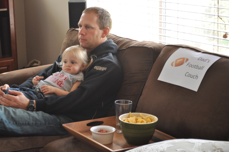 Then, we Jim woke up, we wanted to make sure he could relax and watch football. (This is his goal every Saturday, and it almost never happens.) We put out food and made a sign: Jim’s Football Couch. Haley got on board with the idea and snuggled right in.