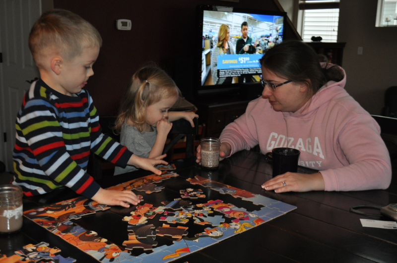 JT, Haley, and Aunt Jennifer worked on a puzzle while they drank hot cocoa. Such a fun morning!