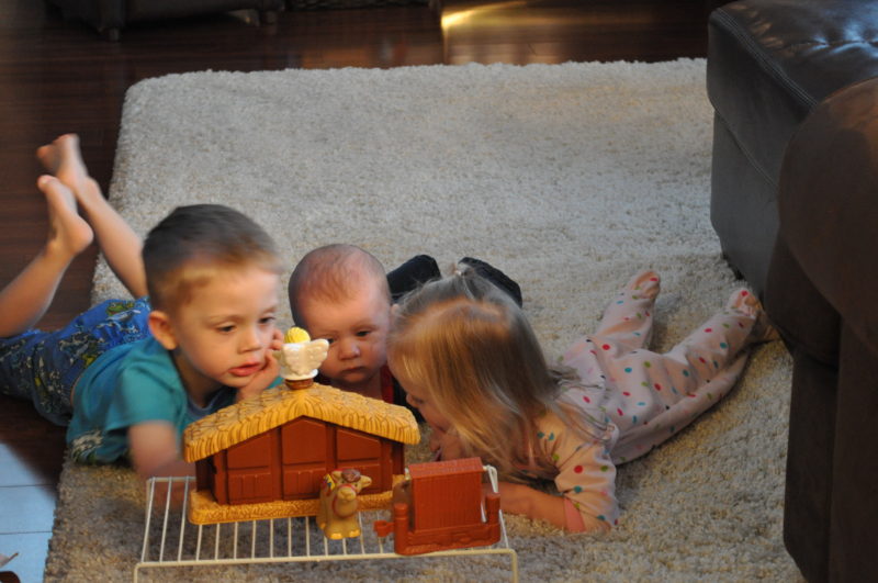 We hosted a birthday breakfast for Jim’s dad last weekend. The kids were super excited to see their cousin Travis again. They both want to hold him and cuddle him and basically smother him while he’s here. But he’s also growing up and able to do some things… like lay on his tummy and look at the nativity while JT and Haley give him the grand tour.