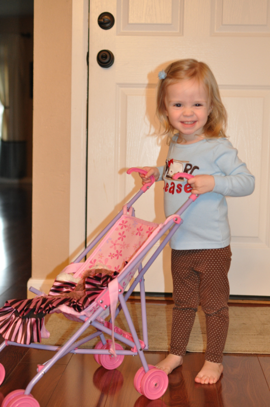 It’s not nearly as fun as the cabins in the snow at our house, but we try. Here’s Haley pushing her kitty in her stroller. They are going to the store.