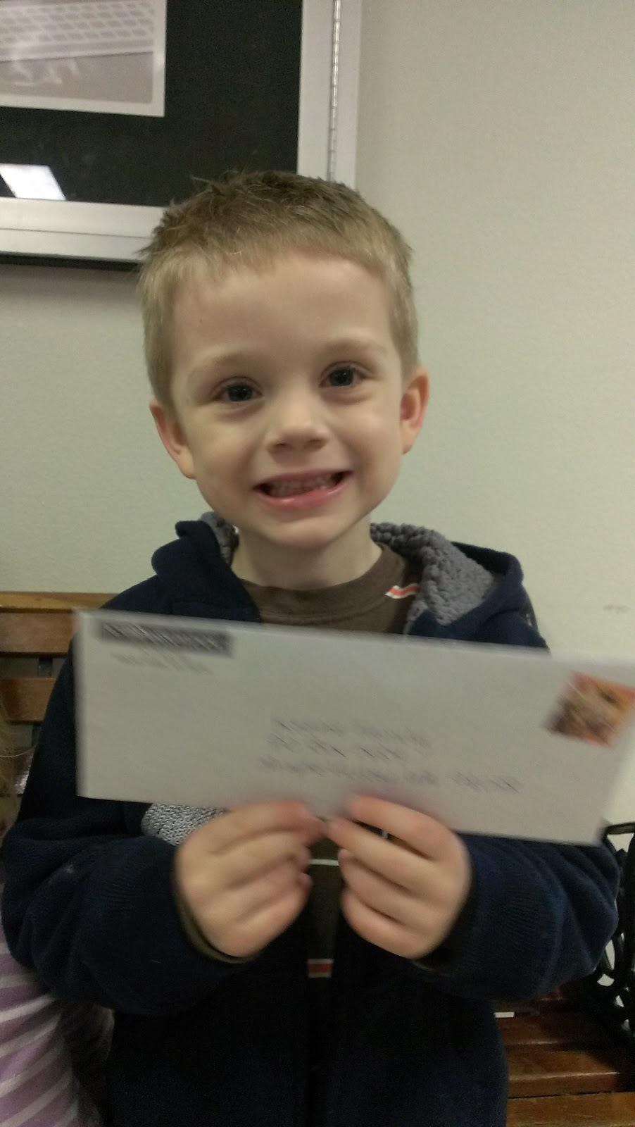| The funny thing is that we have a PO Box, so JT’s envelope only has to travel about twenty feet down the hall! |