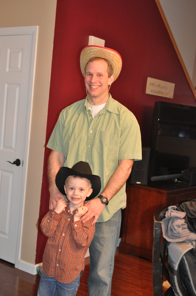 But he was here, and it was a cowboy theme. We borrowed hats from Grandpa and Grandma Cole, who have these sorts of things. Jim’s hat is a little small. π