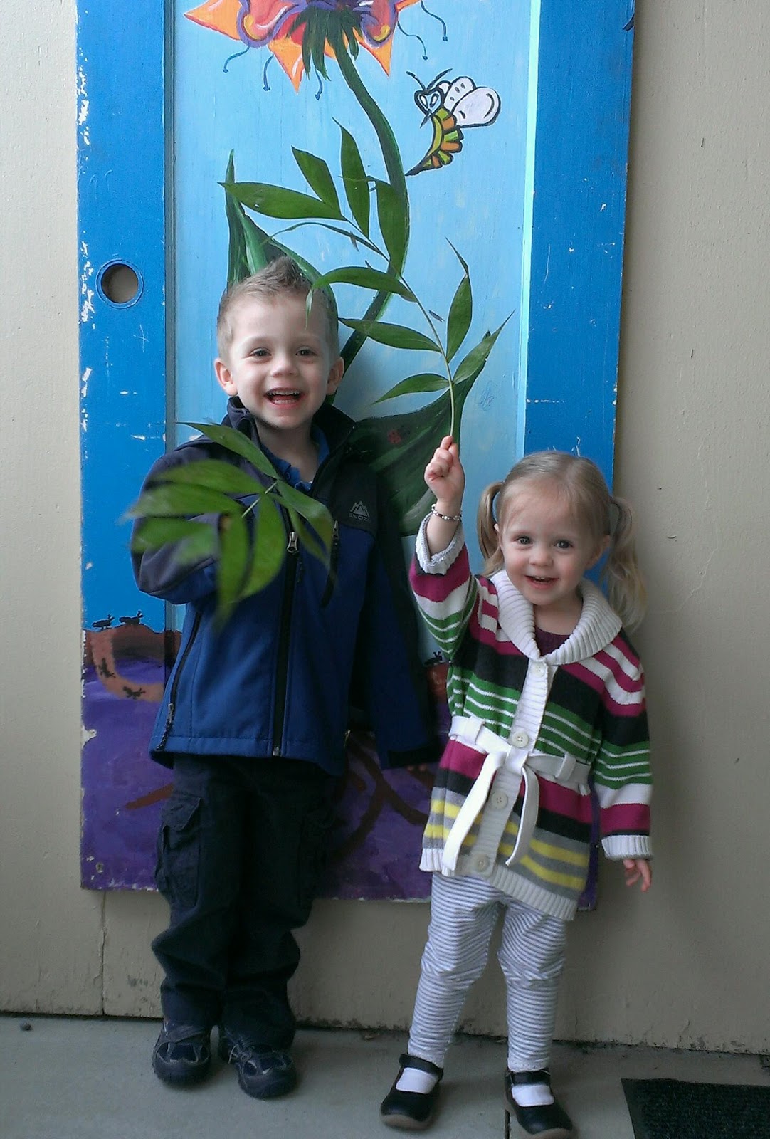 We just love the tradition of palm branches on Palm Sunday. The kids look forward to waving them and yelling “Hosanna!” I got this adorable picture of my two after church this week.