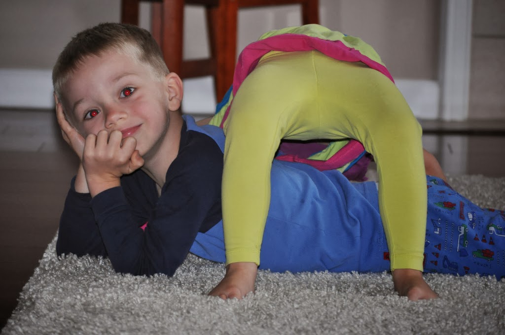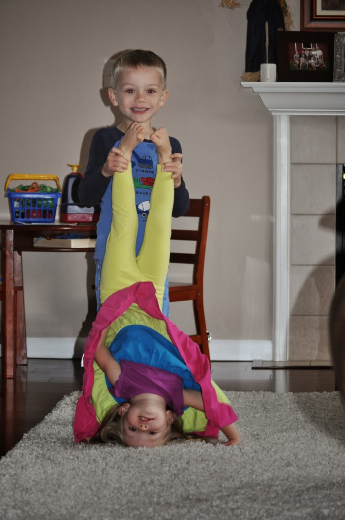 You know the weather must have changed because, suddenly, my children are tumbling all over each other in an effort to burn off some energy. It started off with Haley wanting to do a headstand, and JT said he would help.