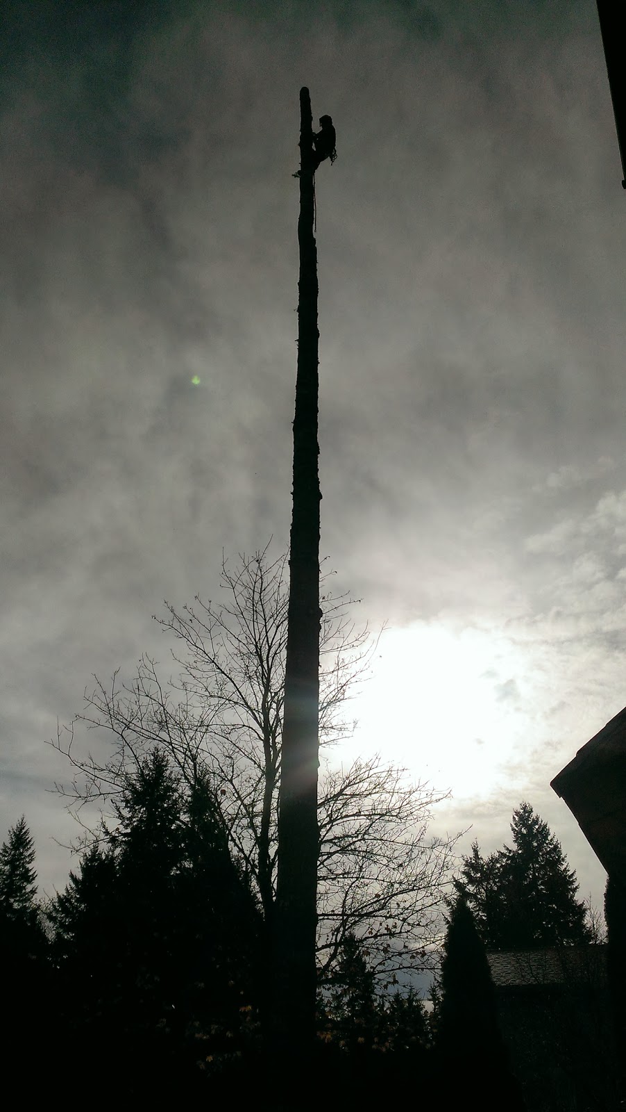 My parents invited us over on Veteran’s Day to watch a tree company take down two old trees. During our windstorm a few weeks ago, one tree fell over and hit my parents’ garage! Fortunately the damage was minimal, but this made them think about taking out the two other trees near the one that fell. We sipped coffee and turned a couch around to face out the window to watch the action.