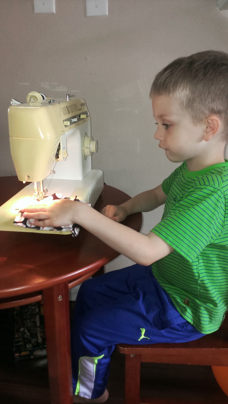 On Saturday afternoon, JT and I did a sewing project. It was his first time using a sewing machine and he really got into it. After we finished his marble bag, he spent a lot of time just making more stitches on scrap fabric. He even stitched a T on a piece of football fabric for his cousin, Travis.