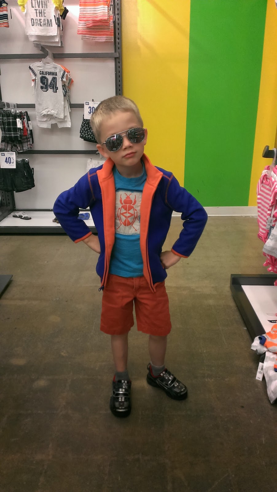 Yesterday I took the kids shopping so JT could get some summer clothes. He is really quite done with 5T shirts, especially if they’ve been washed a bunch and shrunk, and his flip flips are too small. We got some great deals at my favorite stores and he is all set for summer! Check out this goofy pose in Old Navy.