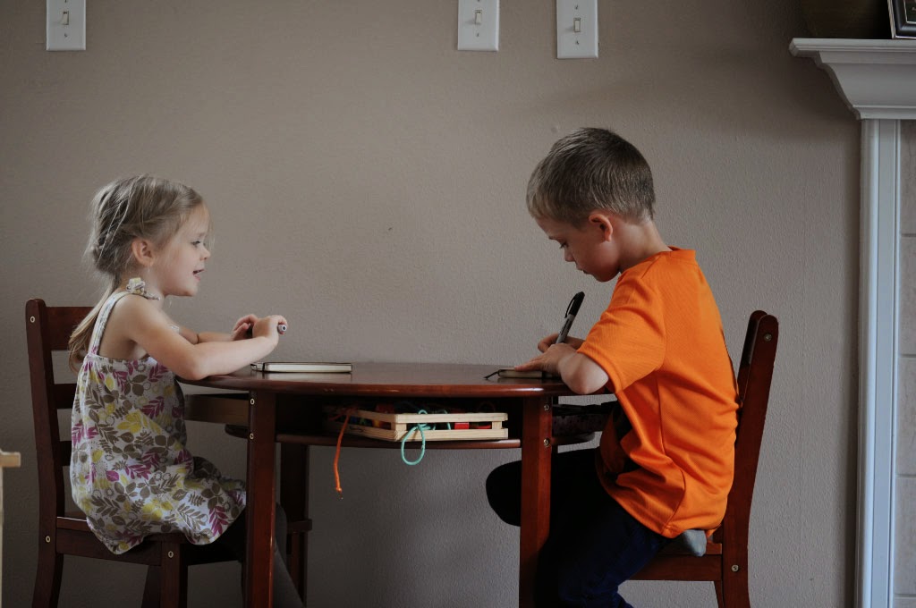 Next they got to work. We talked about how they could write a few words about the book and draw a picture on the page, one page per book, all summer long. We will see how long this lasts, but we’re off to a great start. Haley wrote “Tallulah Tutu” and drew a picture of Tallulah in her tutu. JT got going on a drawing of a police car from his new book.