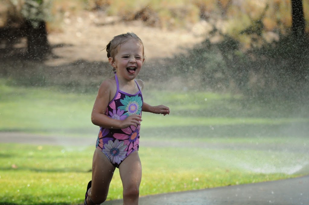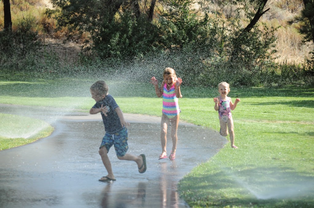 One morning, the kids had fun running through the sprinklers at the campsite.