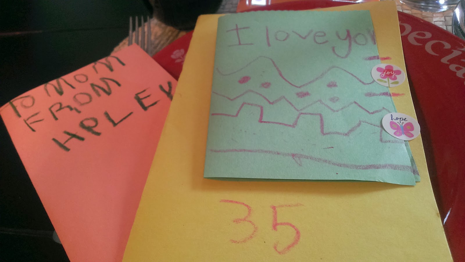 Sunday morning, the kids made me birthday cards and I got lots of hugs and smooches. It was pretty nice. Jim made breakfast so I could get ready for church in an leisurely fashion.