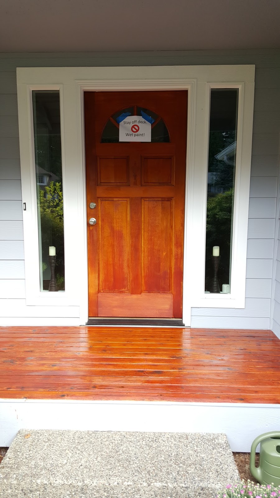 I unpacked the last box in the house Friday night. The garage is still a mess because we’re waiting to finish the shop floor before we move in, but I do have food shelves and access to my new garage refrigerator, and I park the Volvo inside every night. Hooray! So I started on the outside. I told Jim that I’m working in concentric circles. First step: stain the front and back decks and front door. It had been recently pressure washed but was in great need of fresh stain and seal.