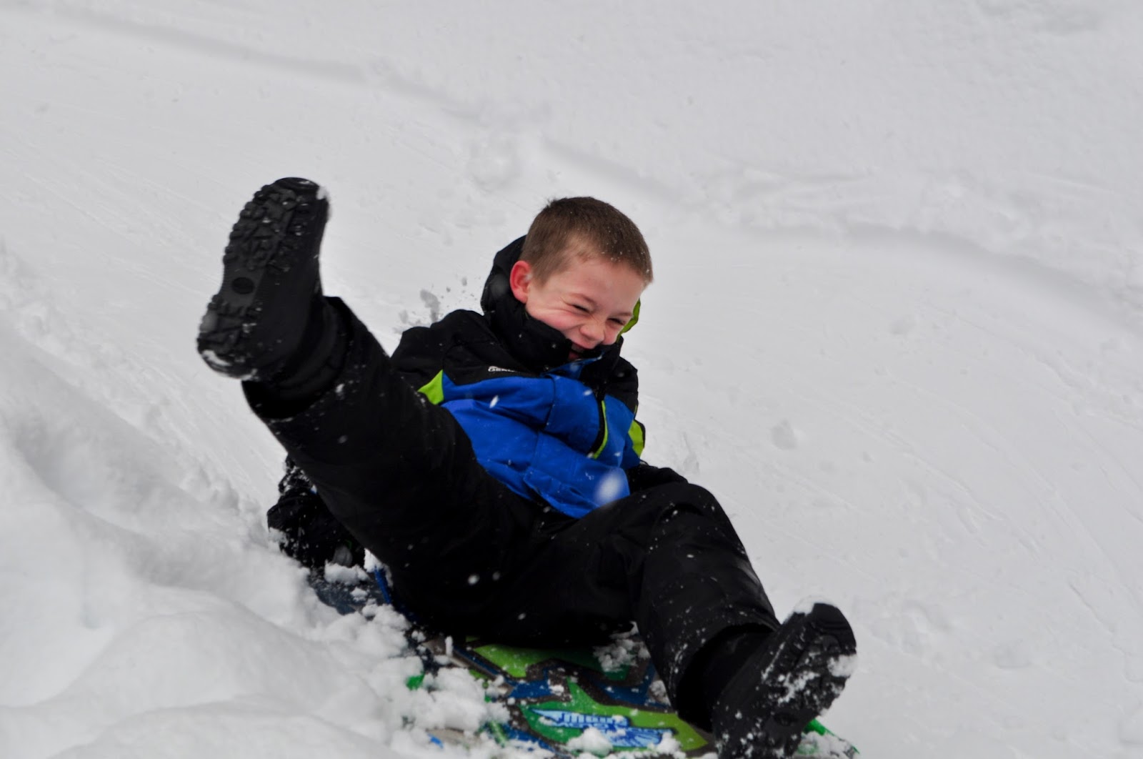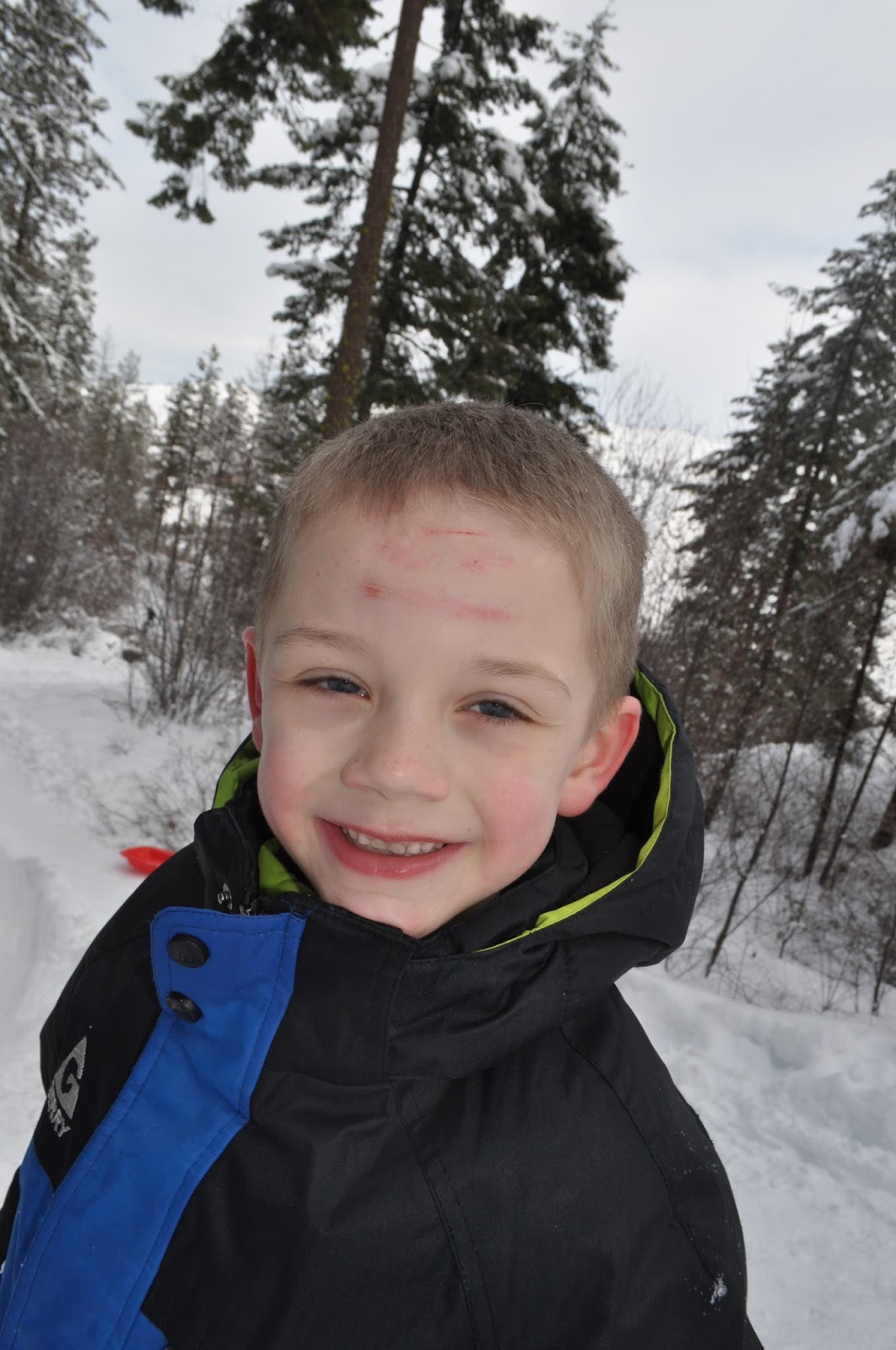 The track was icy on Monday morning and JT proudly set “a new windspeed record” as he luged (how do you spell that? like the Olympic sport on your back) down the track and landed in a bush. He didn’t even report his injuries… but another mom noticed blood on his face and sent word up to his parents so we could check it out. It looks pretty tough!