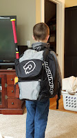 Jim and JT did errands on Saturday and came home with a new hitting helmet and a backpack to keep it in.Â