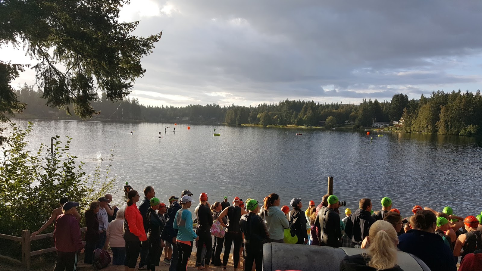 Then on Sunday, I completed my first triathlon. It started nine months ago when I started swimming because I couldn’t run anymore. I started feeling really comfortable swimming, and I swam with a pull buoy because I couldn’t kick. Jim mentioned that was good for triathlons because it saves your legs for the bike and the run. Hm.