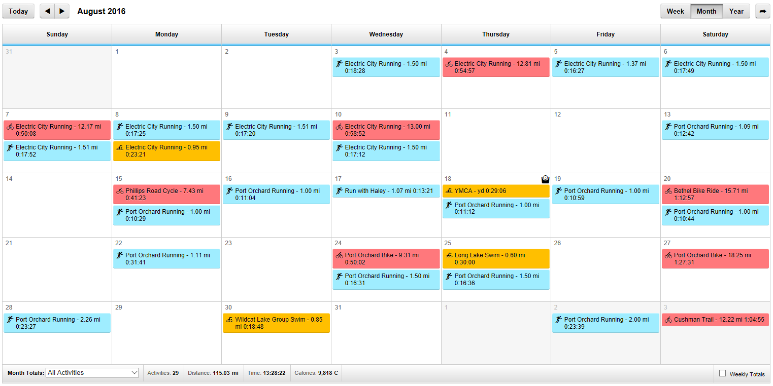The month of August was recovery month. I started keeping better track of my swim/bike/runs, and my Garmin report for the month looks like this: