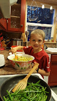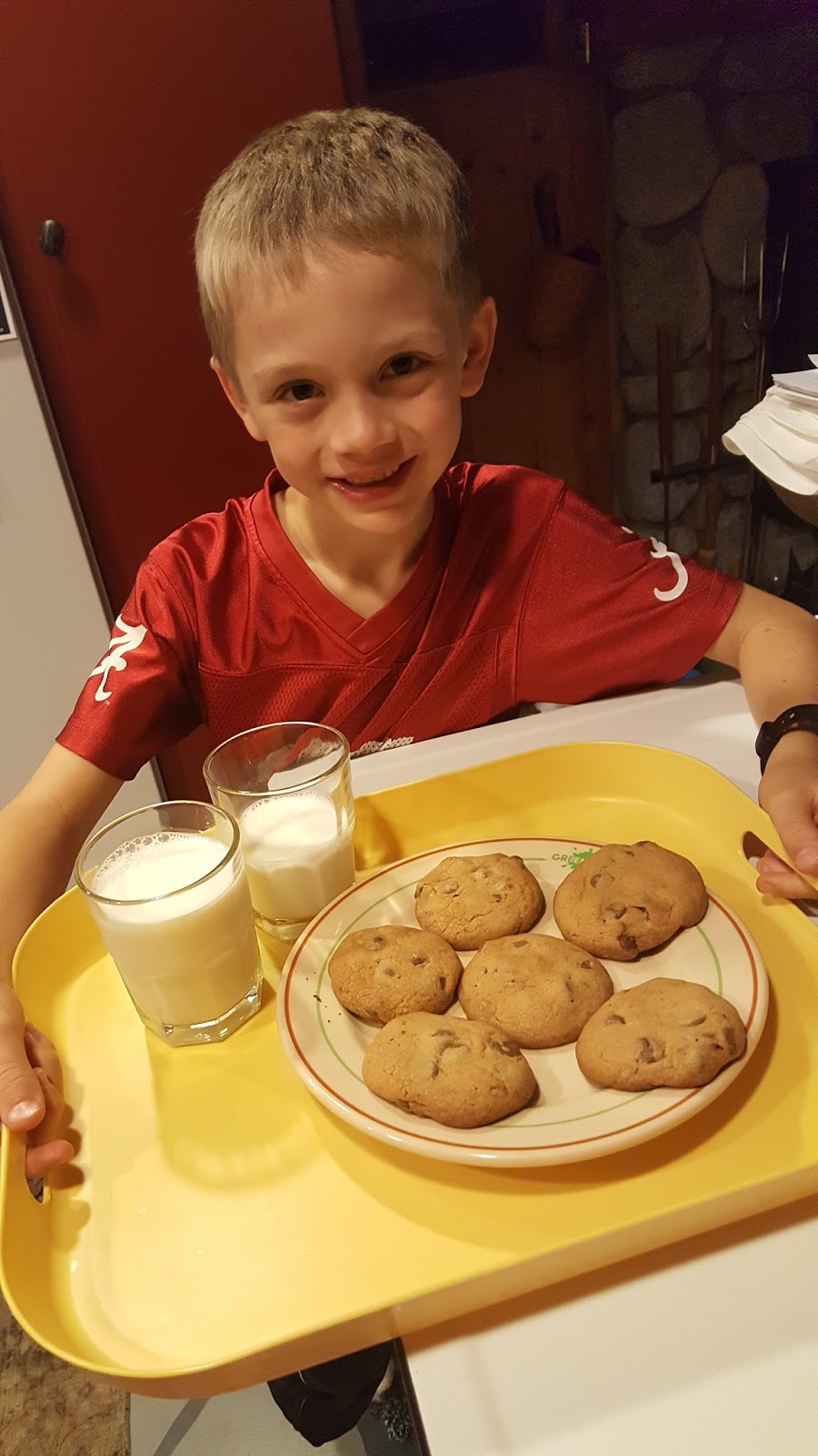 Saturday evening, JT made dinner just like usual. He made chicken pesto, green beans, and grapes. He had a sneaky plan before we left home to make chocolate chip cookies for dessert, so he did that too!