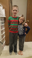 On Wednesday the kids had Christmas sweater day at school. JT still (barely) fits his sweater from last year, and Haley wore a cute sweatshirt from her closet.