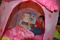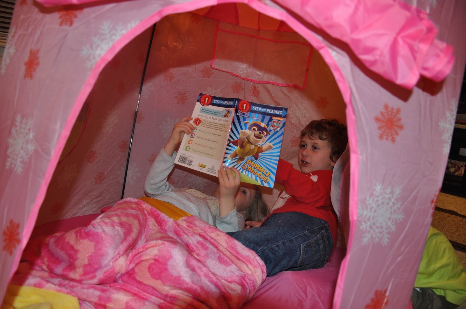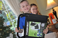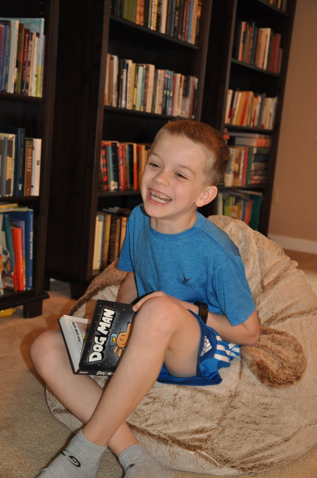 Jim and I forgot to set out their new bean bag chairs under their stockings on Christmas Eve. And then we forgot to get them out Christmas morning. So after our light breakfast (yogurt and ham, cheese, and egg breakfast sandwiches) we finally remembered to get them out. The kids had fun reading their new books while relaxing on their chairs. The beanbags are replacing the brown recliner I recovered for JT years and years ago. We were ready for more portable chairs that could seat two. JT thought his new book Dog Man was hilarious!
