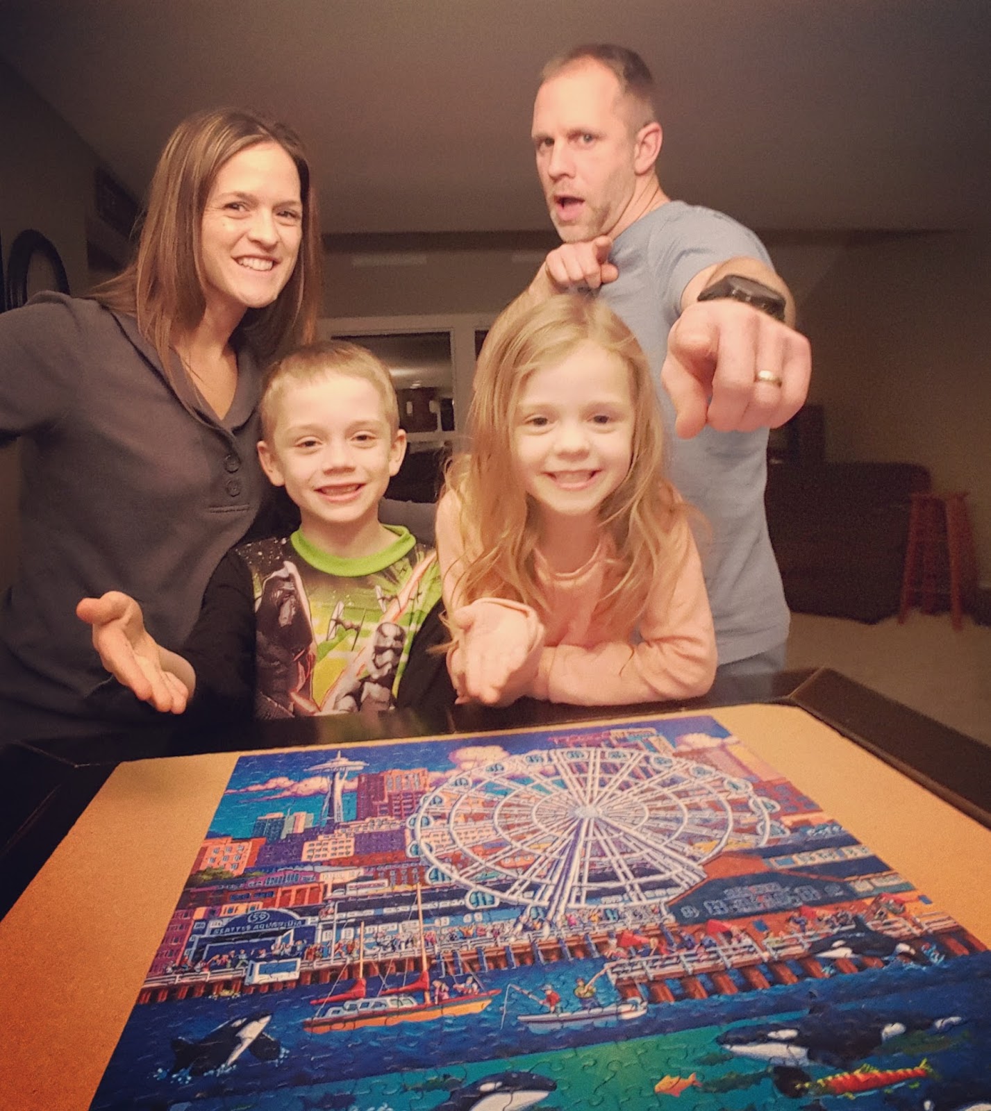 The kids still have a few days of break left, but we’re back to work today. So we finished our family puzzle last night! This puzzle is the kids’ biggest yet – 500 pieces! I was proud of the way they stuck with it and worked for solid blocks of time to finish. I think it’s a new tradition.