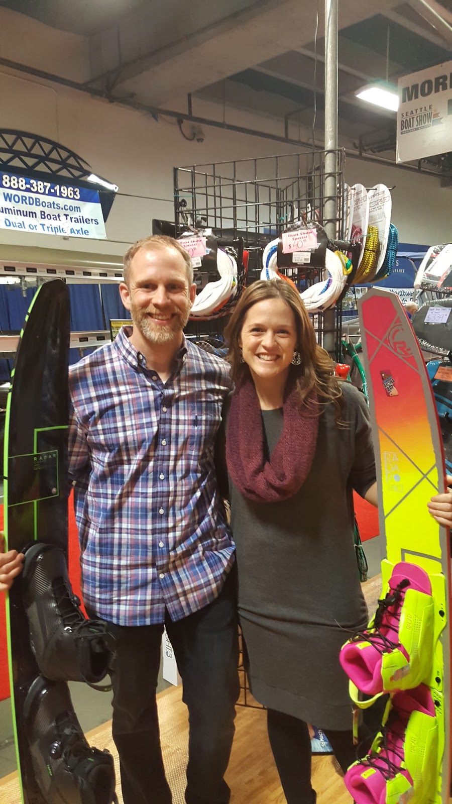Then we drove up the hill to the indoor show, and the garage attendant said there wasn’t a fee to park at Century Link that late in the day. At the show, Jim convinced me to let him buy me a new ski. 🙂 He’s been working on me for a few years now. We were in the Wiley’s booth and he said, “There it is honey, that’s the ski I would get you.” It was the 2016 version of the ski with boat show closeout pricing, so I thought about it and finally said yes. I’m super excited to try it out!