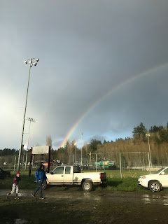 It was an event to remember. The rain was coming in at a 45-degree angle at one point. The sun kept popping out and the wind picked up and blew all the water all over. The kids were chattering instead of smiling for their team picture at home plate, and the microphone kept cutting out so the emcee had to repeat herself. Then, during the National Anthem, no one is quite sure what all occurred but the recording wouldn’t play and a coach took over singing, but then the mic cut out again and he stopped singing, and it sounded like he wouldn’t start again, so the crowd started singing softly and then the coach started again in a different spot, and so we all finished strong together and clapped that it was over. Then we picked up our kids from the sopping wet fields (that aren’t even playable, even though we delayed the season two whole weeks) and drove home under a rainbow. Ahhh…