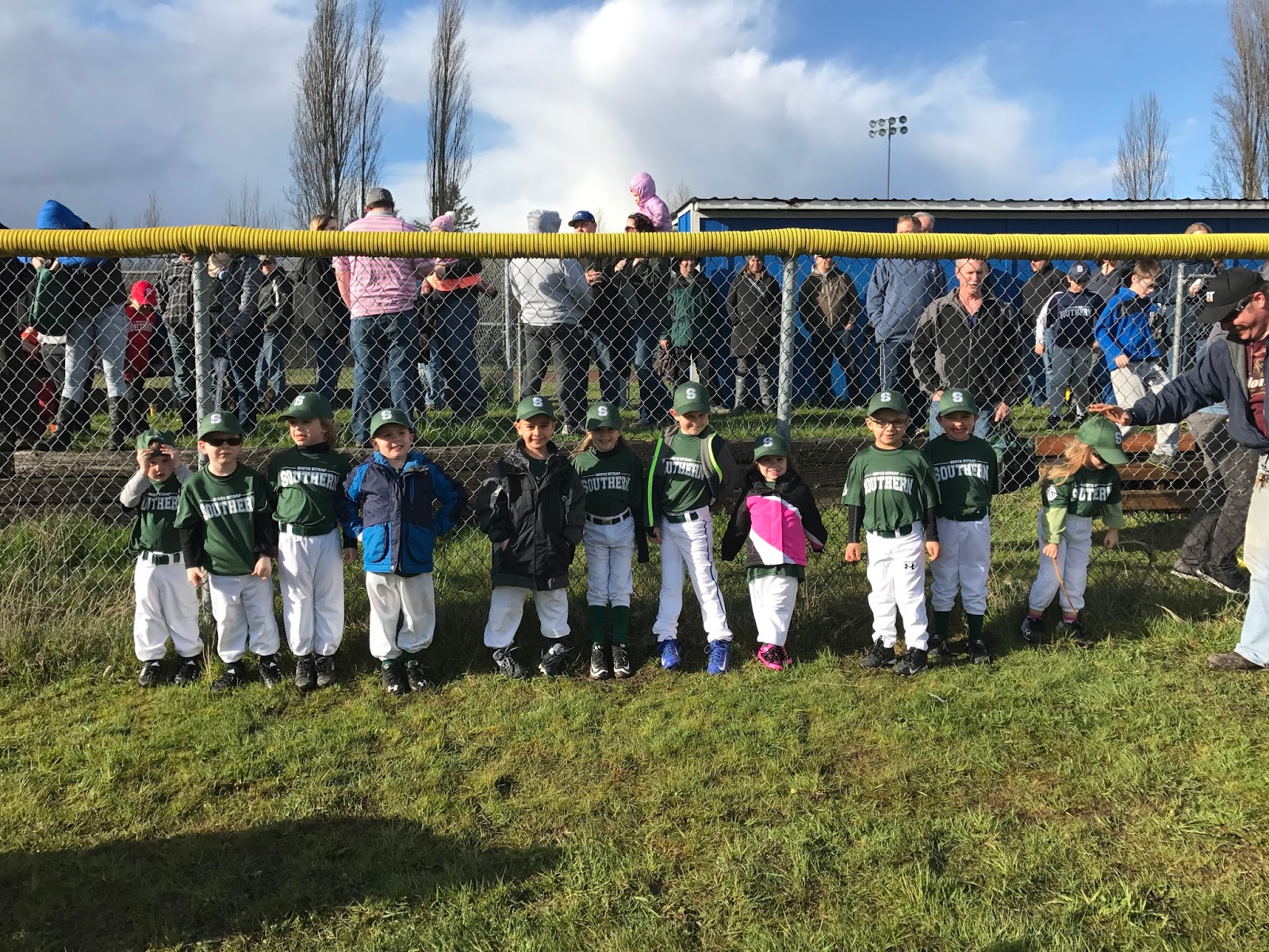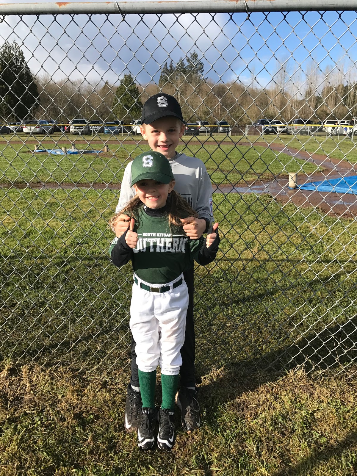 On Monday, “rain or shine,” we had our little league opening ceremonies. I snagged this one shot of dry, smiling children and it went downhill from there. Actually, they both had great attitudes but they were freezing cold (even though we had layered – there is only so much you can do in a uniform).