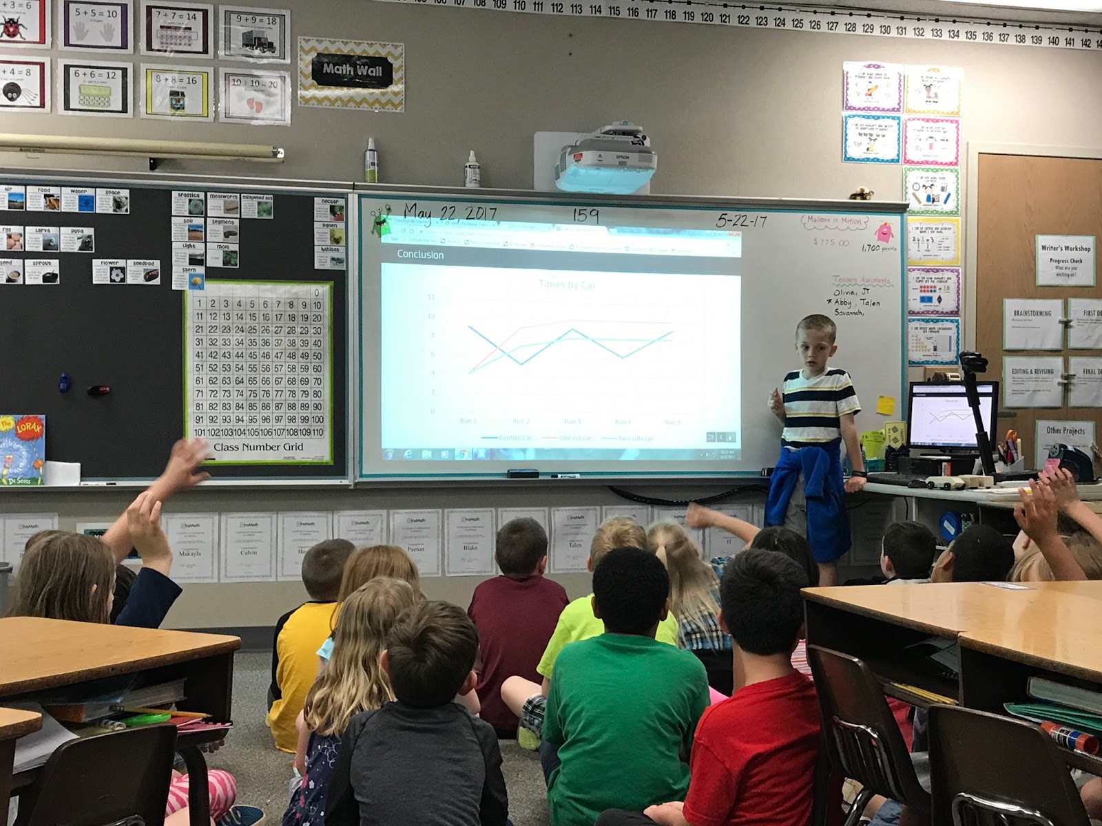 JT had the opportunity to present his PPL (Personal Passion in Learning) Project last week at school. He has been working with Jim and me since early April on all of the components, so this was quite the culmination. His essential question was, “How do aerodynamics affect the speed of a derby car?” Other second graders had topics like “How to make popcorn balls” and “Types of Dogs” so this was a little bit more in-depth! Jim and I were both able to attend his presentation, and Haley joined us from down the hall.