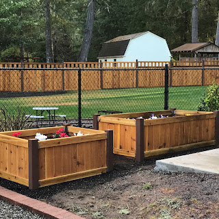Jim finished the second vegetable garden box and filled it with flowers. He also worked on painting the chain link black, which looks soooo much better than silver!