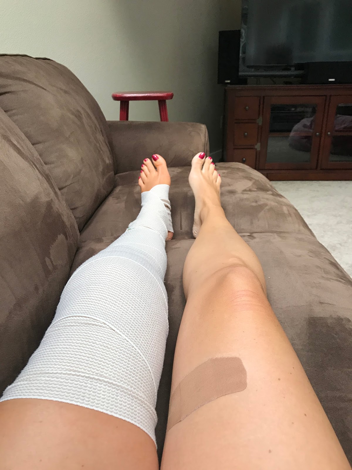 (On my right leg I have two sutures where I had a dermatofibroid removed last week. I’m getting all fixed up! The dermatologist told me to rest up so the scar would heal nicely. What great timing.)