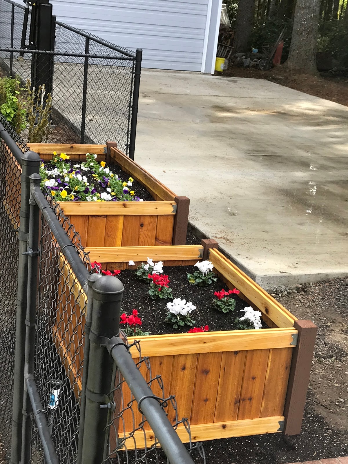 Jim finished the second vegetable garden box and filled it with flowers. He also worked on painting the chain link black, which looks soooo much better than silver!