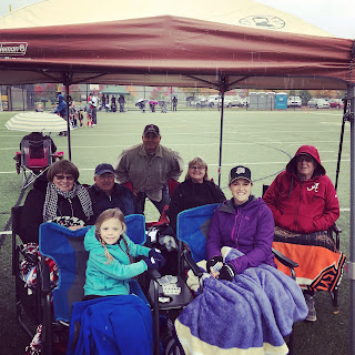 The next weekend, it poured. Fortunately the screen tent that we bought for summer repurposes as a rain shelter. I am thrilled that it worked. It was so nice to have a dry spot to hang out and watch the game without being miserable. We might have to use it for baseball season too. Ha!