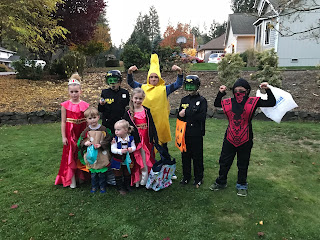 We had a wonderful time spending Halloween with our neighbors and friends again this year. Haley went to open gym at her gymnastics facility first, and then we met up with everyone for pizza at the Drew house. Then we went trick-or-treating with four families represented and lots of running around at dusk. After hitting maybe 12-15 houses, we transitioned to our church harvest carnival to wrap up the evening.