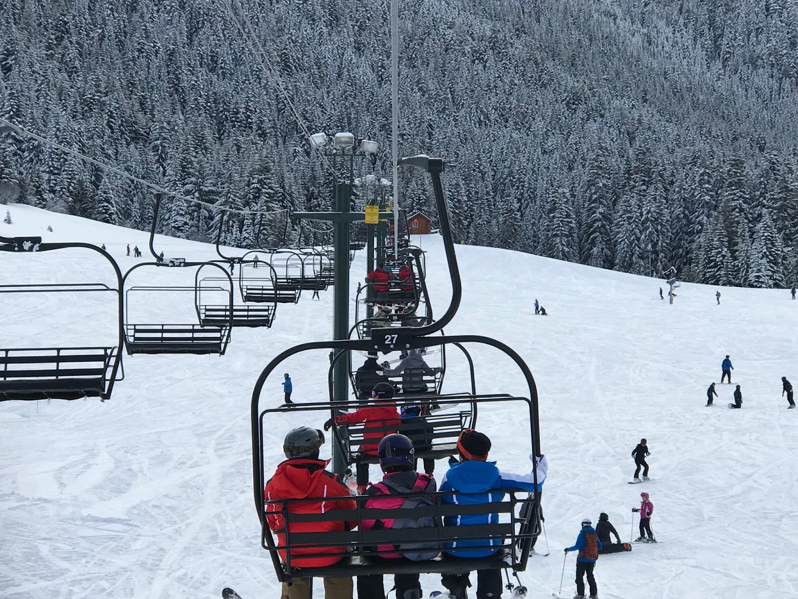 We stuck together in the morning, and then after lunch we split up. Jim and JT went off hiking to get some powder (JT’s idea) and Haley and I went up Forest Queen, where she started getting adventurous and conquered a tough blue square hill with lots of moguls! I was so proud of her!