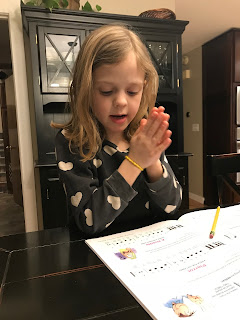 Then I took some more photos as she worked on her piano theory book and hung out with me in the kitchen. She was not happy with this photo shoot but I managed to get some smiles. 🙂