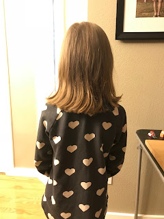 Haley has been asking to cut her hair for well over six months… maybe a year. She thinks it would be easier to brush out, style, and it won’t get in the way at gymnastics (critical). Even in a ponytail, sometimes her hands land on the ponytail and that’s not good. So we talked about it over the weekend, Jim gave his approval, and I cut NINE AND A HALF INCHES off her hair Monday night. Gah!