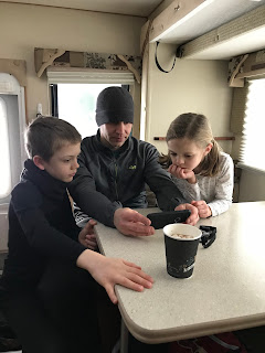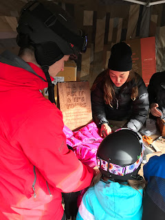In the morning, we ate a yummy pancake breakfast (so far, cooking in the camper is very easy) and headed up the mountain. Jim brought our gear inside during breakfast to warm it up!