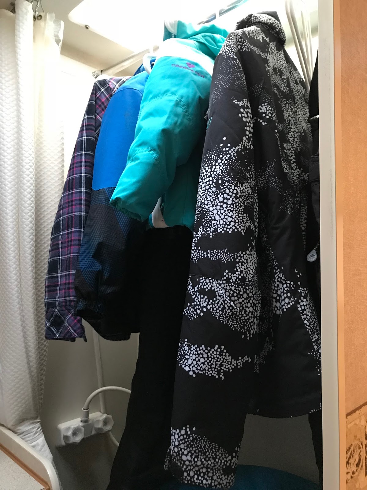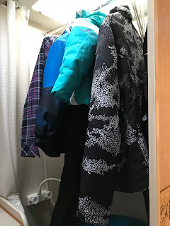 We have a curtain rod in the shower that is built in and meant for a clothes rack. It is a huge plus with four people’s ski gear in the camper!
