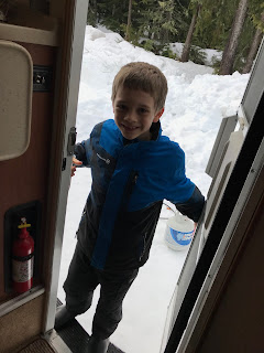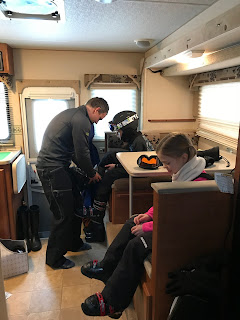 In the morning, we ate a yummy pancake breakfast (so far, cooking in the camper is very easy) and headed up the mountain. Jim brought our gear inside during breakfast to warm it up!