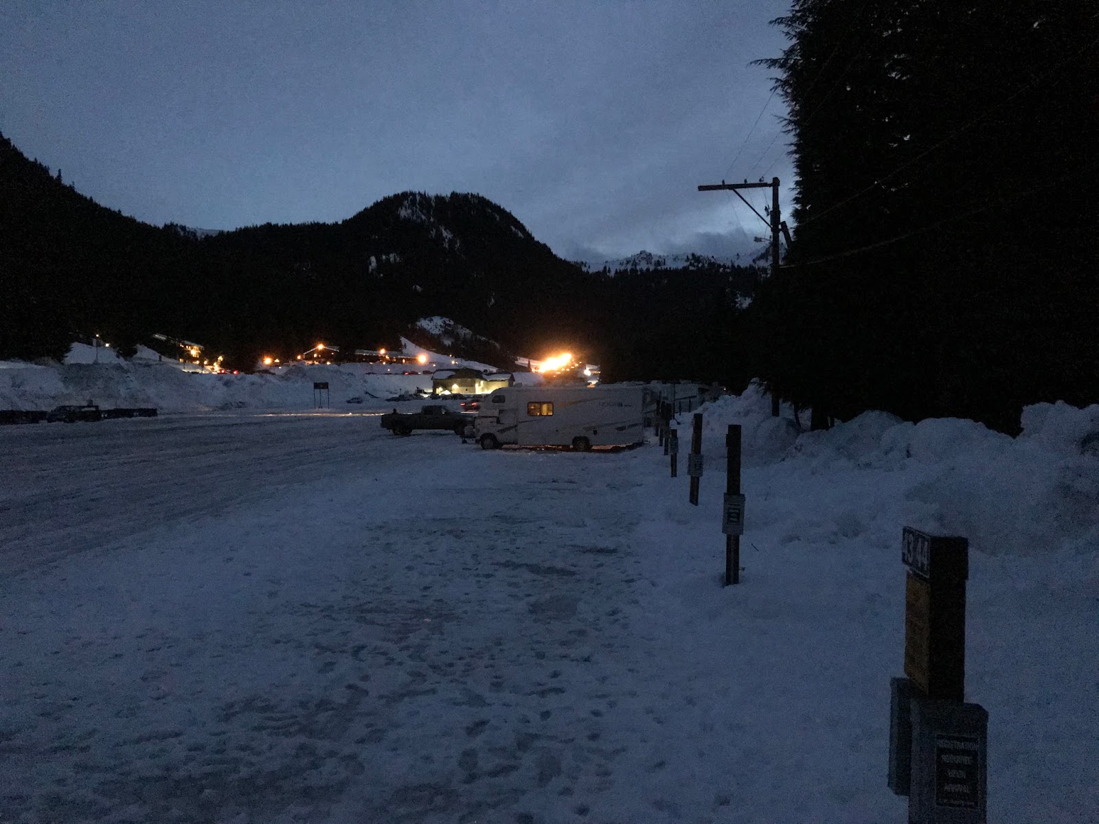 I have been skiing at Crystal Mountain for maybe 30 years or more, and I’ve seen the RVs lined up in the parking lot. We always thought it would be fun to stay the night right there on the mountain. This past weekend, it happened!