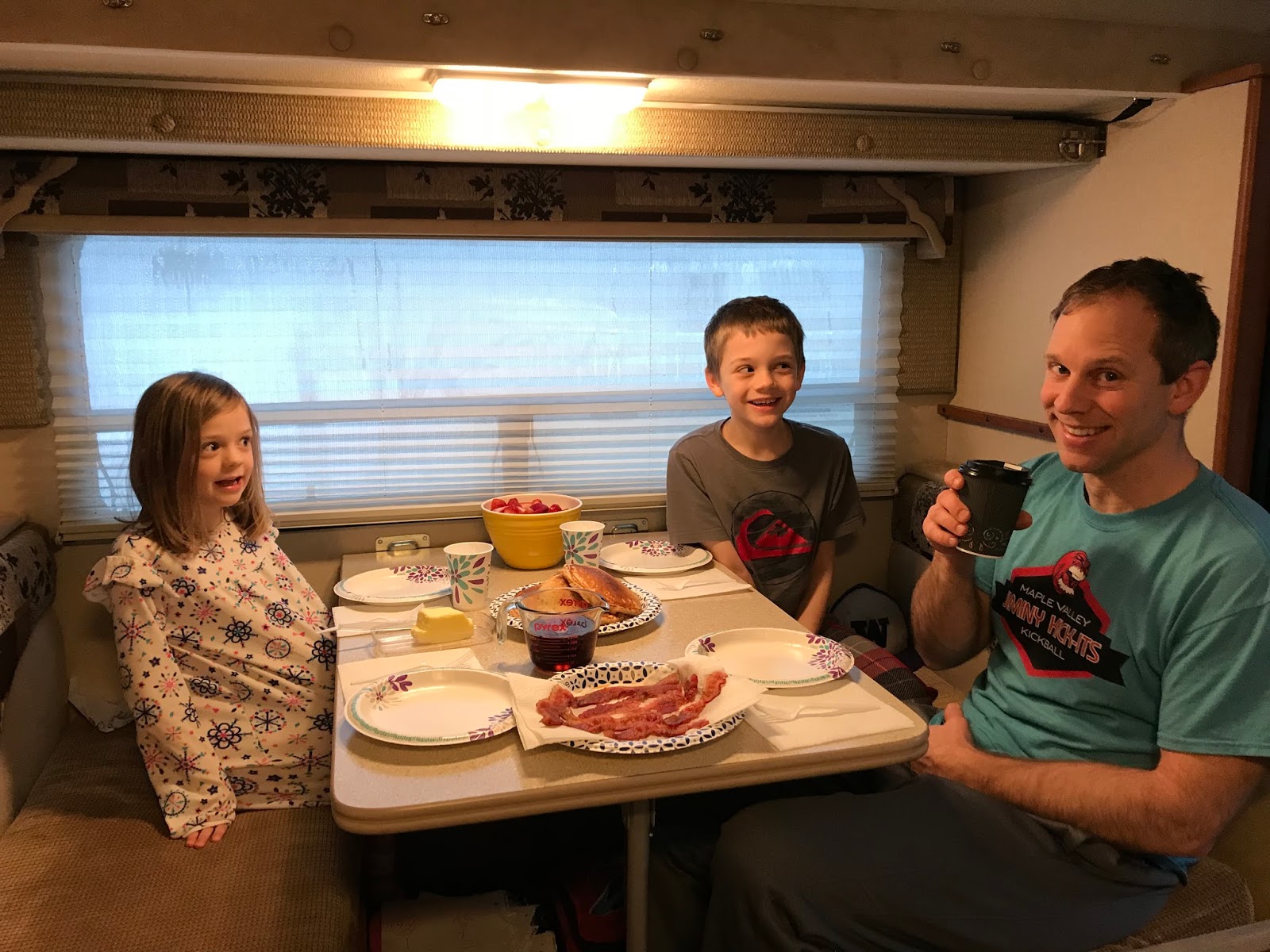 In the morning, we had our second ski start in the camper and found a better routine: indoor prep. It was hot getting ready inside but much simpler.