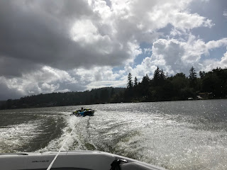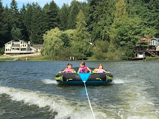 We hosted another summer Roomie Reunion over the weekend! Only four of the six families could make it (one was headed to Ireland, the other double booked with a church group in another city). But we had 20 people here for tubing on the lake, eating pizza, and generally having a great time together. The weather wasn’t ideal – after a few weeks of gorgeous heat, it was suddenly cloudy and raining hard. But that didn’t stop us!