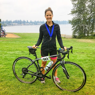 I was so excited to finish the Lake Meridian triathlon 14 minutes ahead of my finish time from last year! I had a great race overall – even if my timing chip came off in my wetsuit. 😦 Fortunately Jim came with me and did an awesome job timing me during each leg, and he captured a few photos as well. One more for the summer!